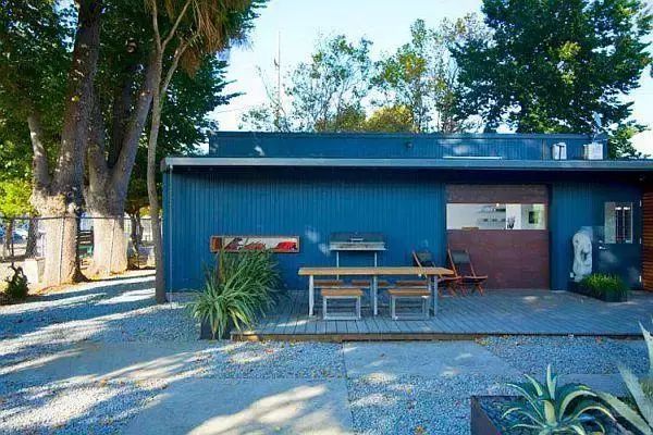 這個賓館是由回收的集裝箱建造的,噴成藍色、切割成2部分,安裝上玻璃和大型的滑動門。